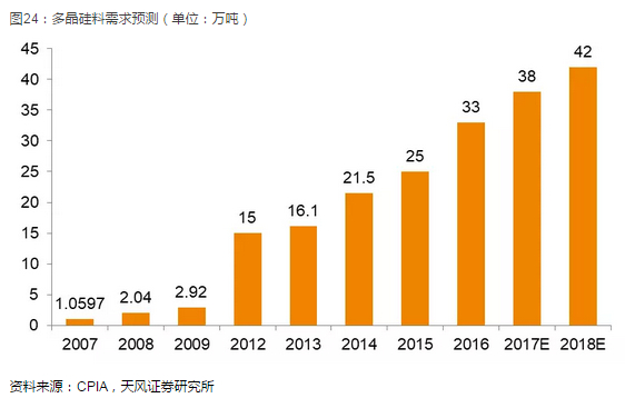 2017年全年国内硅片产出或达到75GW,对应需要约38万吨的硅料。按照主要龙头企业扩产的计划,2018年国内硅片产能将超过100GW。假设明年全球下游装机需求稳定增长,国内硅片产能利用率维持在85%,对应硅片产出约85GW。考虑单晶硅片硅料使用下降,大约需要40-42万吨的硅料产能。