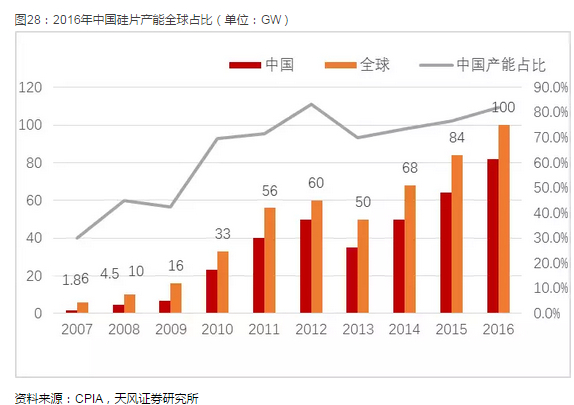 国内光伏市场无疑已经成为全球最大的下游应用市场,自2013年起已经连续四年全球下游市场需求第一,累计装机量也连续两年全球第一。2016年国内新增装机34GW,全球新增装机77GW,国内市场占有率超过44%,今年预计国内装机有望超过50GW,全球预计装机90-100GW,国内下游市场占全球比例将超过一半。