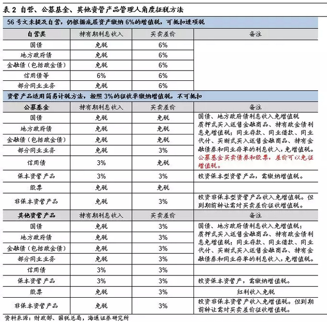 信用债和非标影响更大。信用债和非标类资产需要对利息收入和买卖价差缴纳增值税,相比利率债品种而言影响更大。我们从自营、公募基金、其他资管类机构的角度整理了基于底层资产的具体征税办法,见表2。