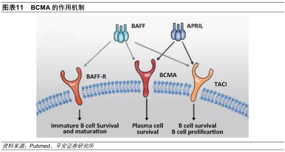 B细胞成熟抗原(BCMA,CD269)是肿瘤坏死因子受体(TNF)超家族成员,主要在浆细胞和部分成熟B细胞中表达,可以结合B细胞激活因子(BAFF)和增殖诱导配体(APRIL)。在多发性骨髓瘤患者中,BCMA普遍在其浆细胞表面表达,而在BCMA敲除的小鼠中,只会影响浆细胞的存活而不影响小鼠健康,因此BCMA成为了治疗多发性骨髓瘤合适的特异性靶点。