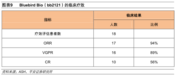在2017年第59届美国血液学会年会上,BluebirdBio公布了CRB-401研究的Ⅰ期临床结果,该试验评估了BCMACAR-T疗法(bb2121)在晚期复发性/难治性多发性骨髓瘤患者中的安全性和有效性。在18例可评估疗效患者中,17例(94%)实现客观缓解,16例(89%)实现非常好的部分缓解(VGPR),10例(56%,确认完全缓解7例,未确认完全缓解3例)实现完全缓解,6个月和9个月的PFS分别为81%和71%。