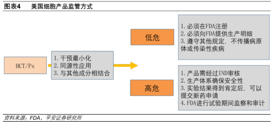 FDA对细胞制品实行的是基于风险的“分层模式”:两大基本原则是干扰最小化和作用同源性,通过评估细胞产品的安全性与毒副作用将细胞产品分为低危高危两种,高危组按照美国公共卫生服务法(PHS)351条进行监管,即按照药品的审评程序;低危组则按照PHS361条进行监管,不需要进行IND申请。CAR-T疗法属于高危组,按照新药审批程序。