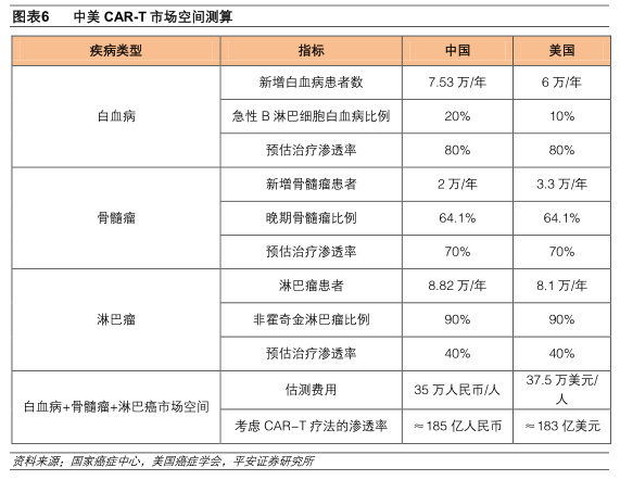 假设治疗费用35万元(参考诺华Kymriah美国定价47.5万美元和KiteYescarta美国定价37.5万美元,按中美之间的人均GDP比例进行转换)),考虑CAR-T疗法渗透率,我国每年新增血液瘤的市场空间总计约185亿元:
