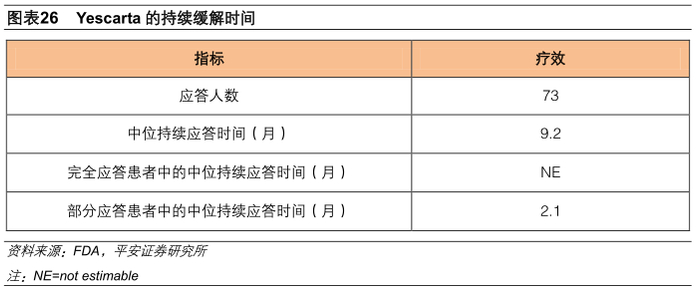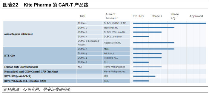 Yescarta于2017年10月18日获得美国FDA的批准,这是美国FDA批准的首款针对多线治疗后复发或难治的成人大B细胞淋巴瘤的CAR-T疗法,Yescarta也是第一款申报EMA上市申请的CAR-T产品。在KitePharma的临床试验中,Yescarta的客观缓解率(ORR)高达72%,完全缓解率(CR)为51%,部分缓解率为(CR)21%。