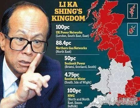 目前,英国近三成天然气市场、四分之一电力分销市场和约7%的供水市场由李家控制,此外,港口、机场与金融市场业务也在李氏收购范围之内。有媒体报道,李嘉诚家族的资产,在英国就有3900亿港币左右,真正的富可敌国。