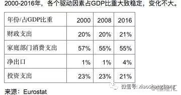 而在欧洲的经济增长中,家庭部门消费支出占到了一半以上,并且非常的稳定,如下表所示: