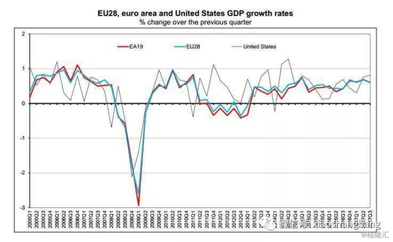 不过,欧洲和美国的GDP在2009年Q1的快速下滑之后,出现了较为明显的回升。并从2013年开始,处于一个良性的增长阶段,如下图所示(以下EA19指欧元区国家,EU28为欧盟国家):