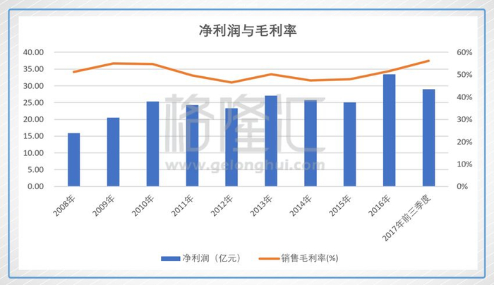 再看看公司历年来的净利润与毛利率。毛利率历年来保持在50%左右的高位,看起来是个暴利行业。净利润也非常稳定,没有什么大起大落,而15年以后曾现了稳健增长的趋势,应该可以推断出是非周期行业的股票。