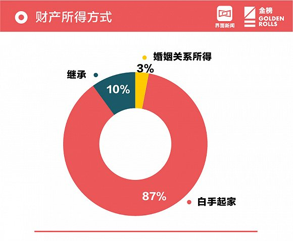 从财产所得方式上看,59位女富豪中,共有51位是白手起家(占比87%),从家族继承得来的有6位,占女富豪总数的10%,如A股中最年轻的董事长阮静波,在家中突发变故之后,勇担重任,出任闰土股份董事长,年纪轻轻却拥有67亿资产,在女富豪榜中位列第22名;而另外3%是从婚姻关系中所得,如涌金的陈金霞在丈夫意外过世后,独自带领“涌金系”,现凭借186亿的资产在女富豪榜中排名第八。