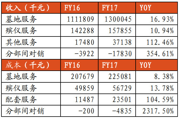 2016年,公司墓地服务收入11.12亿元,销售12486座墓穴,而2017年墓地服务收入13亿元,销售12372座墓穴。