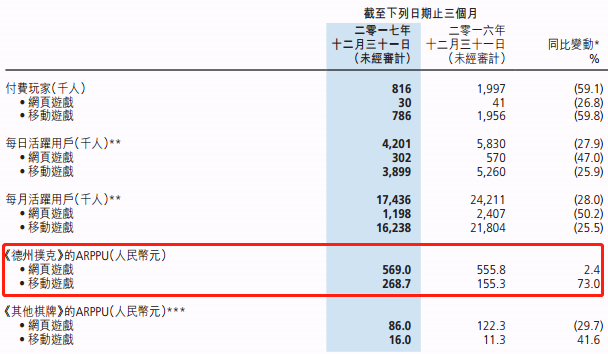 但同行博雅互动却恰恰相反,该公司的德州扑克业务收入占比很大,17年收入5.3亿元,占比总收入72%。博雅互动的业务也分为PC端和移动端,其中主要贡献还是移动端,移动端的月活跃用户数为1623.8万户,占比93.1%,付费玩家78.6万户,占比96.3%。博雅的德州扑克ARPPU非常高,网页端是569元,移动端是268.7元,远远高于其他游戏。