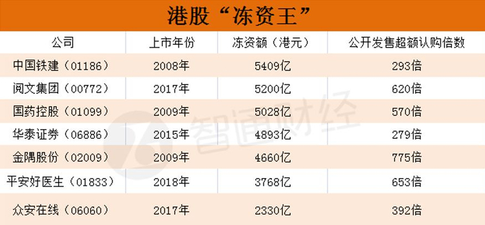 5月4日上市的平安好医生,拟募资逾80亿港元,认购653倍,冻结资金超3768亿港元,为港股新股“冻资王”第十一位。