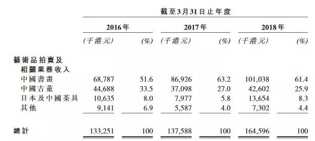 分产品来看,截至2016年、2017年及2018年3月31日止年度,东京中央拍卖公司的收入构成中,中国书画占比最大,于记录期内分别占总收入的比重为51.6%、63.2%、61.4%,录得营收68.79百万港元、86.93百万港元、101.04百万港元;其次为中国古董及日本、中国茶具。