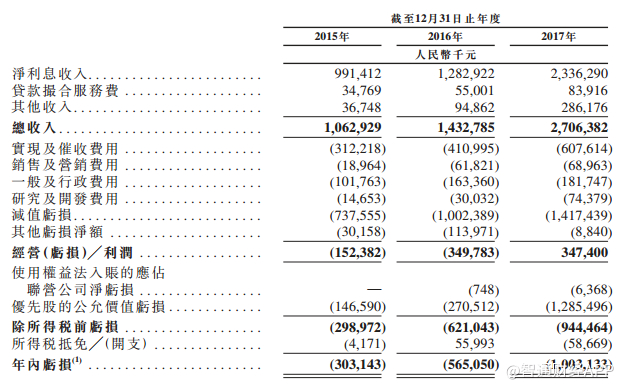 查阅招股书可以发现,随着业务规模的扩大,维信金科的收入逐年增长。2015年、2016年、2017年,维信金科分别实现营收10.6亿元、14.3亿元、27.1亿元,复合增长率59.6%。但利润方面,2015年-2017年,维信金科分别录得亏损净额3亿元、5.7亿元和10亿元。