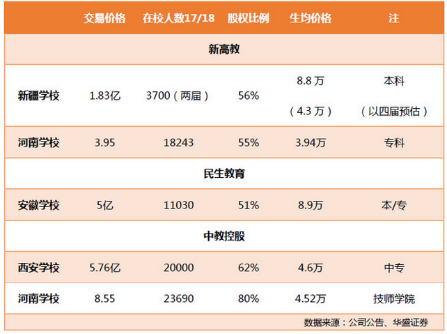 下表为三家公司近期的收购动作,以生均价格和办学层次上来看,新高教的两所学校更具优势(生均价格:收购价/学生人数)。