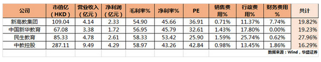 1.新高教:目前旗下运营6所民办高等学校,其中4所本科层次,2所专科层次,旗下学校所在省份高等教育毛入学率均低于全国平均,按各省规划有较大提升空间,近4年学生人数CAGR为 32.9%,考虑河南及新疆学校并表,Wind一致预测FY18-19年净利润为3.06/3.88亿元,对应预期PE为26/21倍。