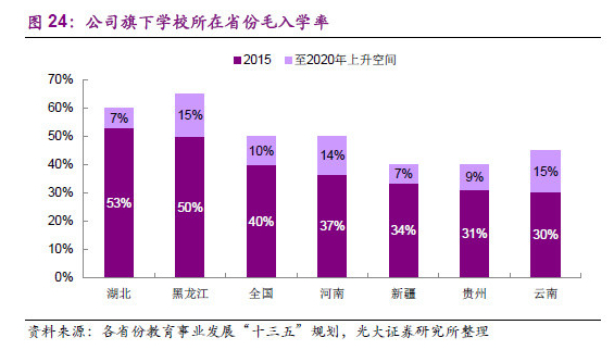 1.内生增长的核心因素:即学生人数增幅和学费增幅。民办高校收入主要来源于学生的学费和住宿费用,在新学年开始后,高校的招生人数即可确定。学费是公开透明的,所以各公司接下来一年的财务数据基本上可以测算出来。学生人数增长和学校所在地的毛入学率、学校层次密切相关;学费增长则和当地经济发展水平挂钩。