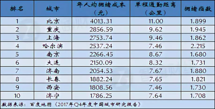 根据百度地图发布的《2017年Q4&年度中国城市研究报告》北京、重庆和上海分别以年人均拥堵成本4013.31元、2856.59元和2753.74元位居前三位,名列第十名的济宁也有1786.25元之多。