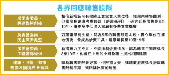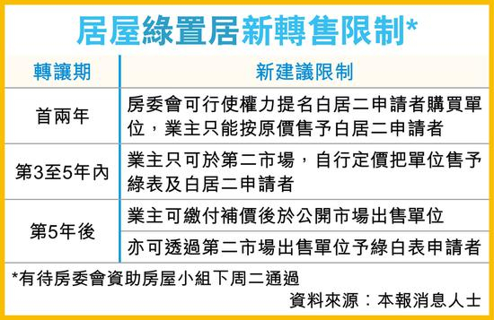 当局亦建议收紧居屋及绿置居的转售限制,首两年只可原价售予‘白居二’买家,直至第5年后才可补价后于自由市场出售。然而,有房委会委员批评新措施作用有限。