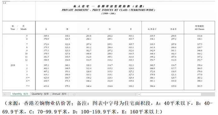 进入2018年,已经披露数据的前7个月,香港住宅价格依然是在逐月上升。7月,香港私人住宅售价指数升到393.5,港岛160平米+的E户型历史上首次突破了30万港币/平米。