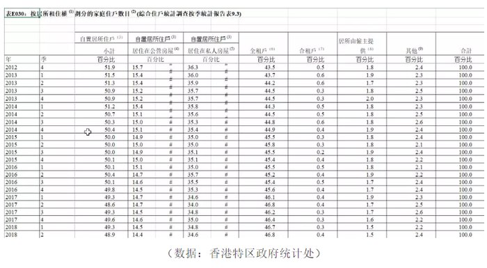 1、香港的住房自有率很低。截至2018年第二季度,香港家庭户接近257万户,人口接近745万人,家庭住房自有率是48.9%,其中,私人商品房屋的自有率只有34.6%(和深圳基本一样)。SARS以来,香港的住房自有率是在走低的,从当时的大约53%慢慢下降到今天的50%以下。这意味着,很多港人想买一套房的欲望是很强大的。