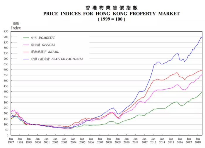 但有一点要指出,在2004至今的大波浪里,香港房地产呈现出非常鲜明的一个特征:住宅价格涨得最慢,工业大楼第一,商铺第二,写字楼第三。相比于2003年时,这四类物业之间的价差拉得越来越大。