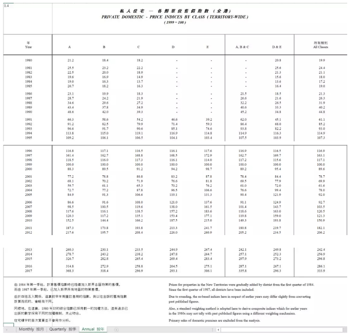 参考这张表,分周期简述。篇幅有限,只谈价格。之前关于香港房地产,已经有过三篇文章,相关背景素材,各位可以对照印证。