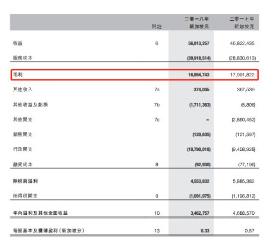 截至2018年3月31日止年度,SHIS LTD实现收益5681.33万新加坡元,同比增加21.3%;毛利1689.47万新加坡元,同比减少6.1%,毛利率较上年同期的38.4%降至29.7%;营收虽然呈现增长态势,但毛利却持续下滑。SHIS LTD将原因归于建筑及建造工程贡献的毛利率减少、外汇亏损及行政开支增加所致。