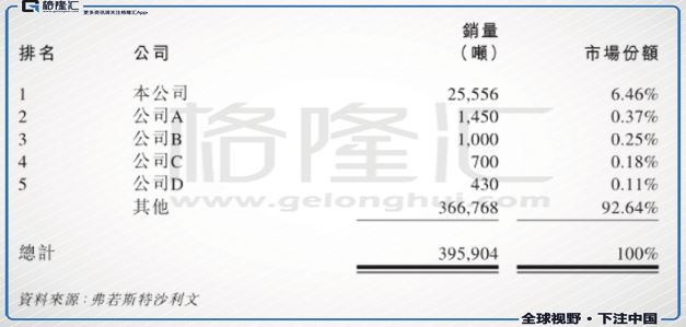根据弗若斯特沙利文的资料,中国的活黄牛养殖和牛羊肉生产属高度分散的行业。作为中国最大的生牦牛肉供应商,按所屠宰的牦牛数量及销量,清河源控股于2017年分别占中国市场份额的约3.1%及6.5%。截至2015年、2016年及2017年12月31日止年度以及截至2018年上半年,公司所出售的肉类总量分别为18,673吨、24,522吨、28,642吨及20,687吨。按所屠宰的牦牛数量及销量计,公司的生牦牛肉供应量计位列第一,份额已超过其四家最接近竞争对手合并后的市场份额。