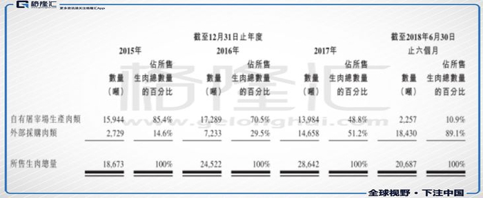 不过,就销售清真生肉而言,公司虽有自有屠宰场的牲畜,包括农场繁育及养殖黄牛及犏牦牛和藏羊,但来源还是主要依靠从其他肉类经销商进行采购再销售。截至2015年、2016年及2017年12月31日止年度以及截至2018年6月30日止六个月,公司的外部采购肉总量分别约为2,729吨、7,233吨、14,658吨及18,430吨,分别约占各相关期间出售的生肉的14.6%、29.5%、51.2%及89.1%,呈现越来越依赖外部采购肉的趋势。