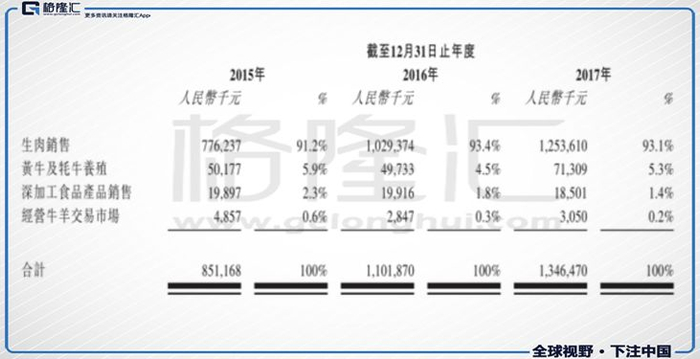 截至2018年上半年,公司生肉销售额达到8.88亿元,占到公司总收入的94.1%。黄牛及牦牛养殖分部产生的收益为4.9%;深加工食品产品分部产生的收益仅有1.0%;牛羊交易市场分部产生的收益也长期接近于0。