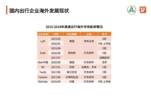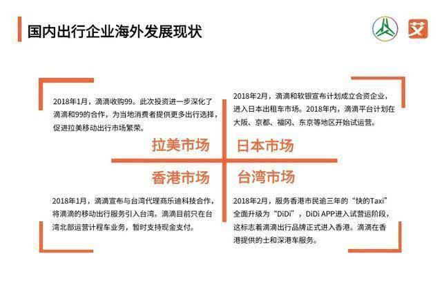 艾媒咨询在今年7月发布的2017-2018中国共享出行年度发展报告中指出,滴滴出行在近三年时间里通过投资或产品技术合作等形式,将全球合作网络延伸至北美、东南亚、南亚、南美等1000多个城市,覆盖全球70%以上的市场,当时的目的是为了在全球范围内对竞争对手Uber围追堵截。今年上半年,滴滴则主要开拓了拉美市场、日本市场、中国香港市场和中国台湾市场。