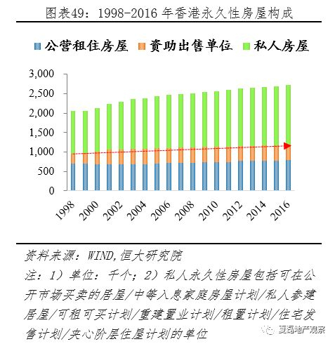 香港兴建了大量的公营房屋,占房屋总量比重高达44%,包括公营租住房屋与资助出售房屋两种。2017年公营租住房屋单位80.8万个,资助出售单位40万个,合计120.8万个,占香港非临时性房屋比重的44%。