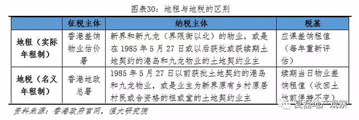 土地年租分地租与地税两种,主要区别在于纳税主体不同。(1)地租即“实际年租制”,征税主体为香港差饷物业估价署,纳税主体是适用于新界和新九龙(界限街以北)的物业,或是在1985年5月27日(《中英联合声明》生效日)或以后获批或获续期土地契约的港岛和九龙物业的土地契约业主。地租纳税税基为应课差饷租值,税率为3%。(2)地税即“名义年租制”,征税主体为香港地政总署,纳税主体是在1985年5月27日以前获批土地契约的港岛和九龙物业,或是业主为新界原有乡村原居村民或合资格的祖或堂的土地契约业主。地税纳税税基是续期当日物业差饷租值,税率为3%。