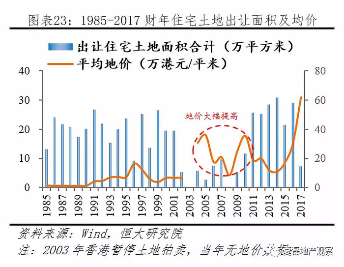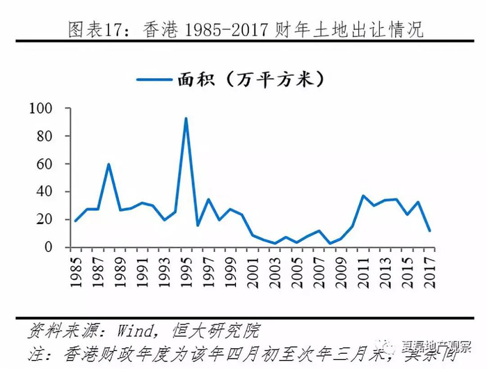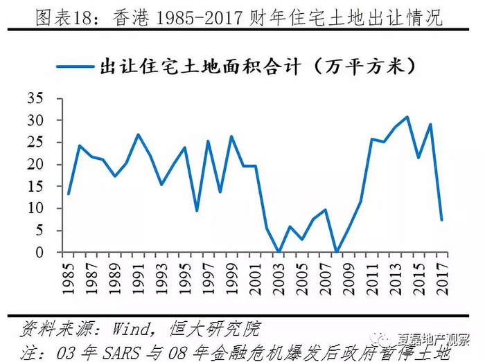 政府土地供给长期不足。1985-2017财年,政府累计出让土地779万平米(年均23.59万平米),其中住宅用地556万平米(年均16.84万平米);同期,香港年末人口增长198万(从1984年末的543万增长到2017年末的741万),人均增加土地供应2.81平米。