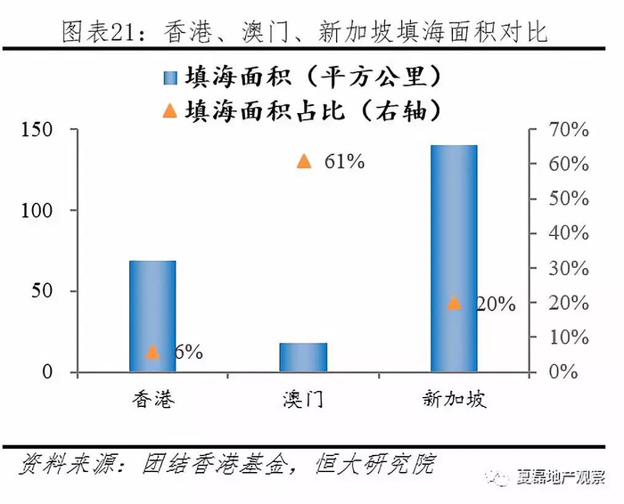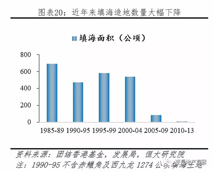 供给不足原因二:因环保人士抗议,2005年以来填海造地大幅减少。由于土地可开发数量有限,填海造地成为政府新增土地的重要来源。1887年以来,政府填海造地面积超过69平方公里,占已开发城市土地的25%,约容纳香港27%的人口与70%的写字楼总楼面面积。由于大量环保人士抗议填海,2005年以来政府填海造地几近停顿。2005-2009年间填海面积只有84公顷,2010-2013年低至8公顷。截至2012年中,全港未经批租或拨用的、用于住宅建设的土地(扣除不适合/现时未能发展的土地),仅剩3.92平方公里,土地短缺问题严峻。