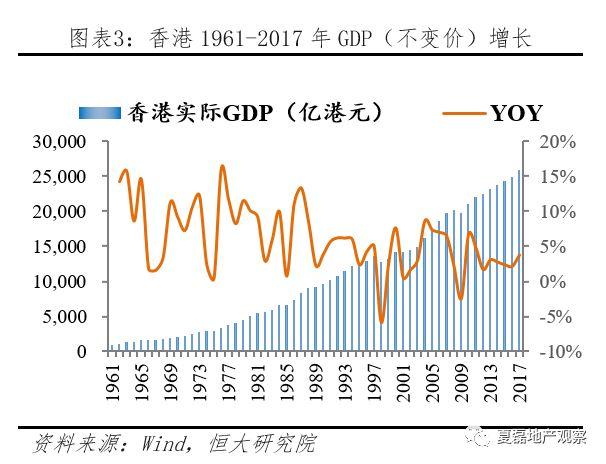 在贸易物流等产业带动下,香港经济实现腾飞。香港岛开埠以后,从传统的小渔村转变为重要的贸易港口;50-70年代转型工业化,纺织、成衣、电子等劳动密集型工业快速发展;80年代后,金融地产、贸易物流等成为主导产业,推动香港经济向金融服务业转型。1961-2017年,香港GDP(不变价)从988亿港元增长到25852亿港元,年均增长5.89%,人均GDP高达57713美元,是全球最富裕的地区之一。