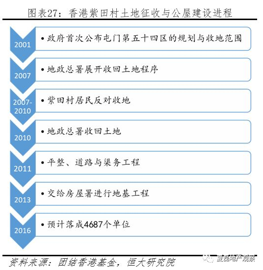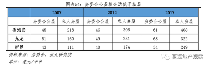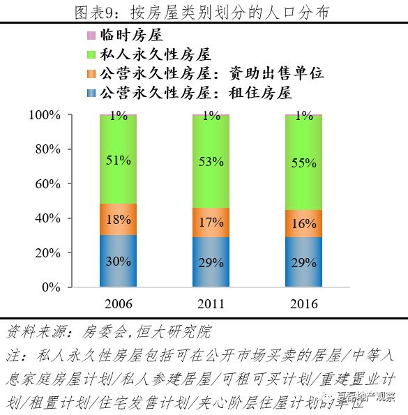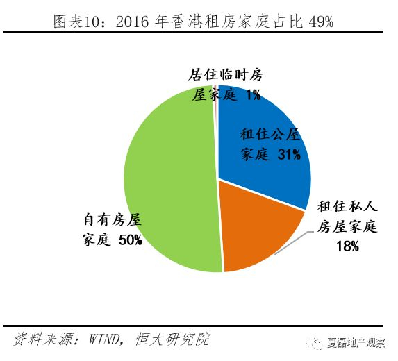从市场结构看,香港住房供给呈现“双轨制”。(1)政府主导建设的公营房屋数量众多,居住人口占比近半。公营房屋包括公营租住房屋(简称公屋,类似廉租房)与资助出售单位(类似经济适用房,以居屋为主)两类。2016年,公屋居住人口占香港人口29%,资助出售单位居住人口占16%,合计占比45%。(2)公屋数量众多,叠加房价过高,香港近一半家庭选择租房。2016年,租住公屋与私人房屋的家庭合计122.4万户,占香港家庭比重的49%。