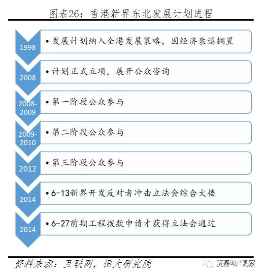 典型如“新界东北发展计划”。政府计划将古洞、粉岭北和坪輋/打鼓岭的农地划出为新界东北新发展区,预计可建成5.4万个住宅单位(60%为政府公营房屋)。2008年发展计划立项以来,经过了三阶段公众参与,但仍有部分社会团体因担忧毁坏村民家园、破坏生态农业、涉嫌利益输送、反对香港内地融合、浪费财政等原由予以反对,直到2014年6月发展计划前期工程拨款申请才获得立法会通过。
