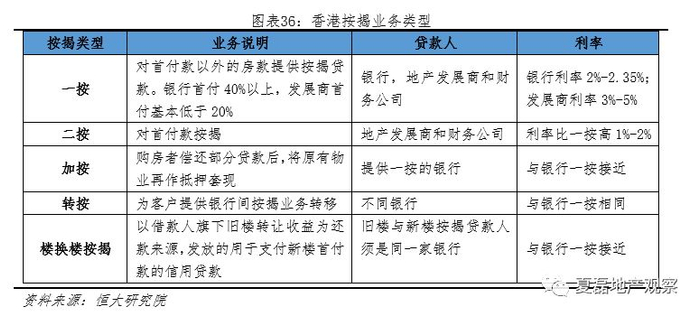 香港按揭业务灵活多样,支持多形式按揭贷款,包括“一按”、“二按”、“加按”、“转按”、“楼换楼按揭”,还款方式灵活。“一按”指对首付款以外的房款提供按揭贷款;“二按”指对首付款按揭;“加按”指偿还部分贷款后,将原有物业再作抵押套现;“转按”指为客户提供按揭业务在银行间转移;“楼换楼按揭”指以借款人旗下旧楼转让收益为还款来源,发放的用于支付新楼首付款的信用贷款。此外,还款周期分每月还款或每两周还款,既有等额本金和等额本息还款,又有固定期限和固定额度期限随利率变化还款,还可根据借款人收入情况设定的递增还款和递减还款。