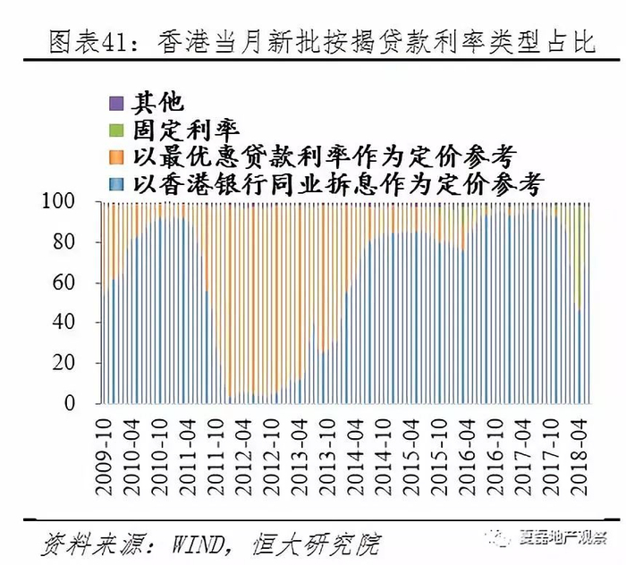 按揭贷款以浮动利率为主,主要参考银行同业拆借利率。香港住房按揭主要有三种定价方式:(1)以香港银行同业拆借利率作为定价参考,是2014年以来最主要的按揭贷款方式,占比接近90%。(2)以最优惠贷款利率作为定价参考,最优惠贷款利率自2009年以来保持5%(近期汇丰银行上调至5.125%)。(3)保持固定利率。由于同业拆借利率波动范围大,部分银行采取两种利率定价相结合的方式。如汇丰香港银行推出的银行同业拆息按揭计划,贷款期30年,按揭利率紧贴银行同业拆息变化(一个月HIBOR+1.6%),并设置以港元最优惠利率为基准的利率上限(2.25%)。