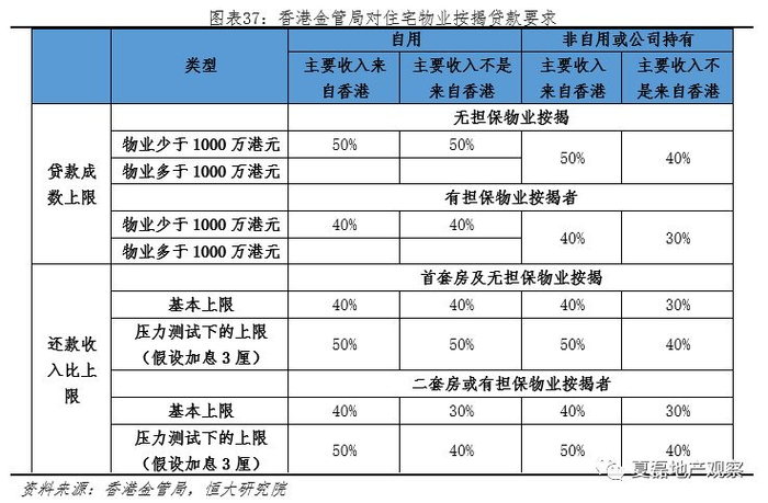 银行一按要求严格,首付要求40%以上。为遏制炒房投机,2009年起香港收紧按揭贷款要求。香港居民购买首套房最低首付比例提高至40%,月还款收入比(包括信用卡等债务还款)上限50%;若房价超过1000万港元、已就其他按揭物业做出借贷或担保、购买第二套房,首付比与还款收入比要求进一步提高。