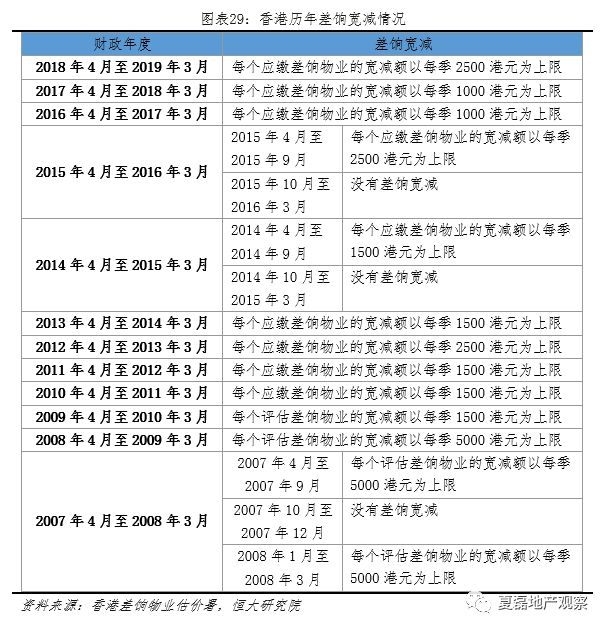 差饷税基为应课差饷租值,税率5%。应课差饷租值指截止到某一指定估价日期时,假设在市场上按年出租可得的年租,估值及征收由香港差饷物业估价署负责。政府常年宽减差饷,但额度不高。如2018年4月至2019年3月,规定每个应缴差饷物业的宽减额为每季2500港元,如物业该季度应缴差饷额不超过2500港元,将宽免该季度差饷。但香港房屋月租金普遍在4000港元以上,差饷宽减力度有限。