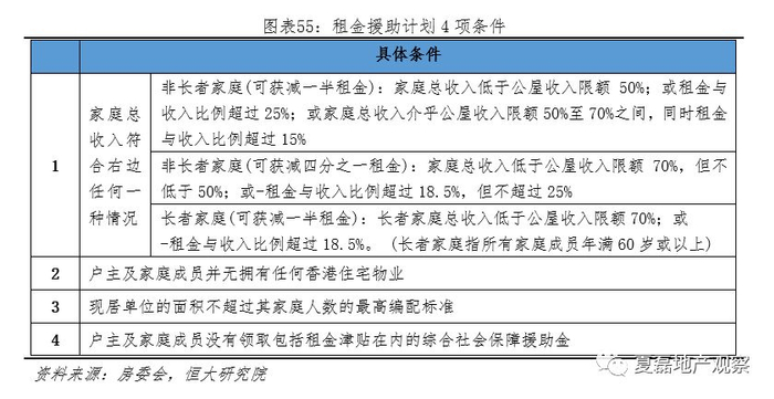 公屋租金低廉,并对困难租户宽减租金。公屋起源于1954年的徙置屋建设,1972年港英政府启动“十年建屋计划”,开始大规模的公屋建设。公屋租金根据收入指数每两年调整,该指数利用2.4万个公屋家庭收入数据编制而成,若指数上升,公屋租金涨幅取指数涨幅与10%的较小者,若指数下降,则按照跌幅减少租金。目前,公屋平均月租金1880港元(含差饷、管理费与维修保养),仅为私人房屋1/3到1/7。对于有经济困难的公屋租户,房委会还设有租金援助计划,两年内可获减四份之一或一半租金。