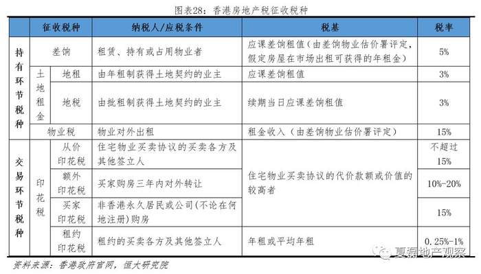 保有环节税负低。保有环节基于租金征税,包括5%的差饷与3%的土地租金,出租物业另缴15%的物业税。但差饷与土地租金只占物业价值0.2%-0.5%,与欧美物业税1%-2%相比偏低。