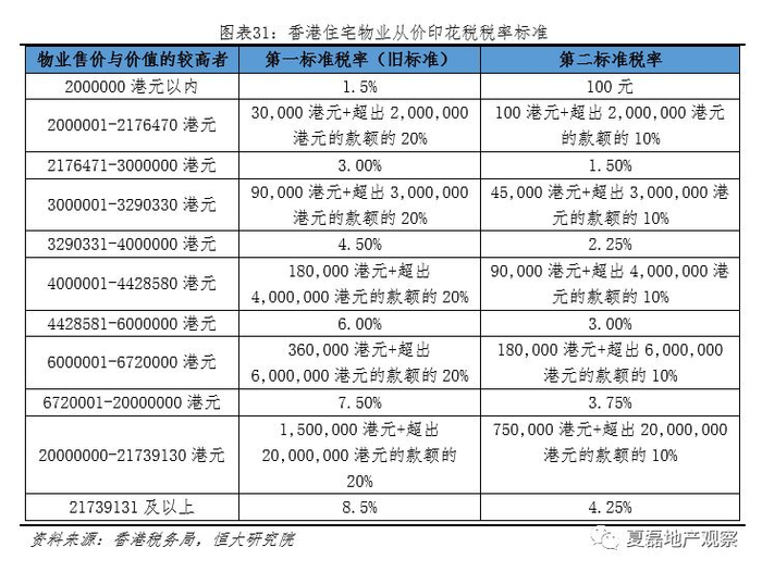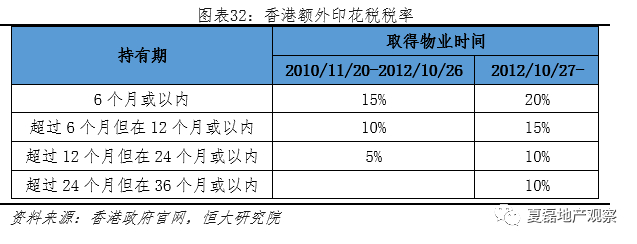 交易环节征收重税。香港居民购买首套房须缴纳4.5%以下的从价印花税,购买二套以上住房缴纳15%的从价印花税;非香港居民购房除缴纳15%的从价印花税,还须缴纳15%的买家印花税。此外,如果购买的是未满3年内转售的房屋,买家还须与卖家共同缴纳10%-20%的额外印花税。税基均为物业售价或评估价的较高者。