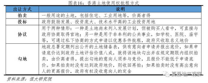 政府出让土地方式包括公开拍卖、投标、协议与勾地,以公开拍卖为主。公开拍卖适用于一般住宅、工业等用途的土地,是主要出让方式;投标、协议主要用于涉及社会公益、公共事业或政府鼓励投资建设的土地;勾地则在土地拍卖前增加询价程序,避免土地贱卖与流拍。勾地于1999年推出,2004-2010年土地市场低迷,政府全面采用勾地方式出让土地,2013年取消勾地。