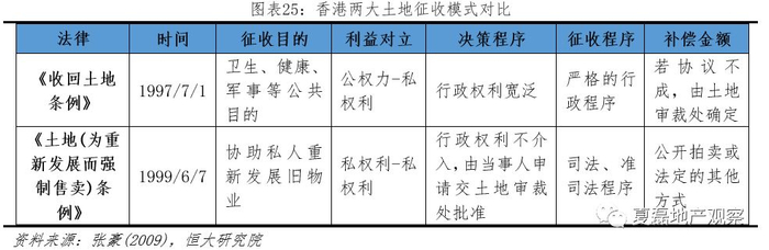 香港的土地征收包括三类:(1)依据《收回土地条例》,政府因卫生、健康、军事等公共目的有权收回土地,主要用于公营房屋、道路基建、军事基地等项目建设;(2)依据《土地(为重新发展而强制售卖)条例》,针对分散的多业主的物业而强制征收土地,用于私人重新发展旧物业;(3)特定历史时期内,政府为征收新界原居民根据传统习惯法享有的土地所有权,而制定的特别的土地征收政策,现已不适用(林峰2007)。