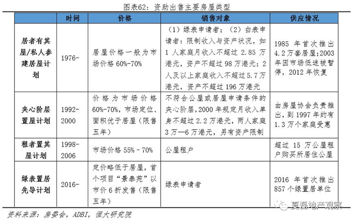 资助出售房屋类型多样,以居屋为主,主要面向中低收入群体。1976年,房委会推出“居者有其屋计划”,将居者有其屋屋苑(简称居屋)低价出售给公屋租户和其他符合资产收入限制的中低收入家庭,之后陆续推出“私人参建居屋计划”、“租者置其屋计划”、“夹心阶层置屋计划”、“可租可买计划”、“重建置业计划”、“绿表置居先导计划”,满足不同收入阶层的购房需求。(注:房屋委员会用‘绿表’和‘白表’来区别不同类别的申请人,绿表申请人指公屋住户,或经核实合资格获编配公屋单位的特定组别,包括合资格入住公屋的受清拆影响人士及灾民等七类;‘白表’申请人包括三类:私营房屋的住户、公屋或任何资助房屋计划单位住户的家庭成员、单位售出日期不足十年的‘租者置其屋计划’单位买家)