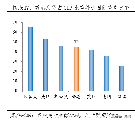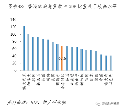 按揭业务灵活多样,叠加房贷利率宽松,刺激居民加杠杆购房意愿,香港居民杠杆在国际上处于较高水平。2017年,香港居民按揭贷款余额1.21万亿,占GDP比重的45%,高于英国、德国、日本等发达国家。2016年香港家庭总贷款占GDP比重的67.6%,居民杠杆处于国际较高水平。